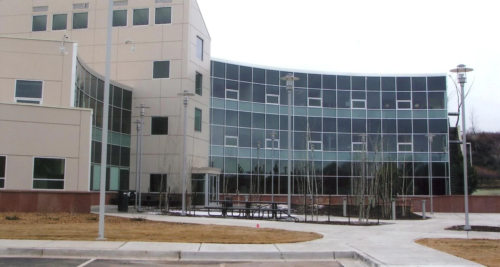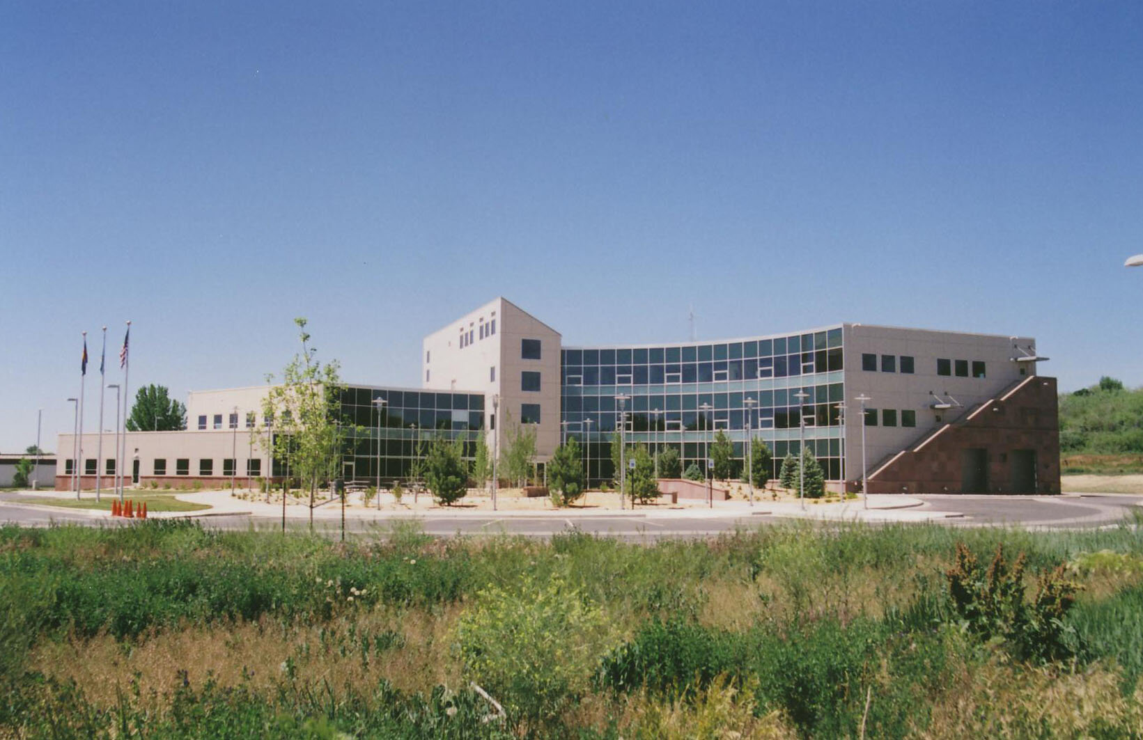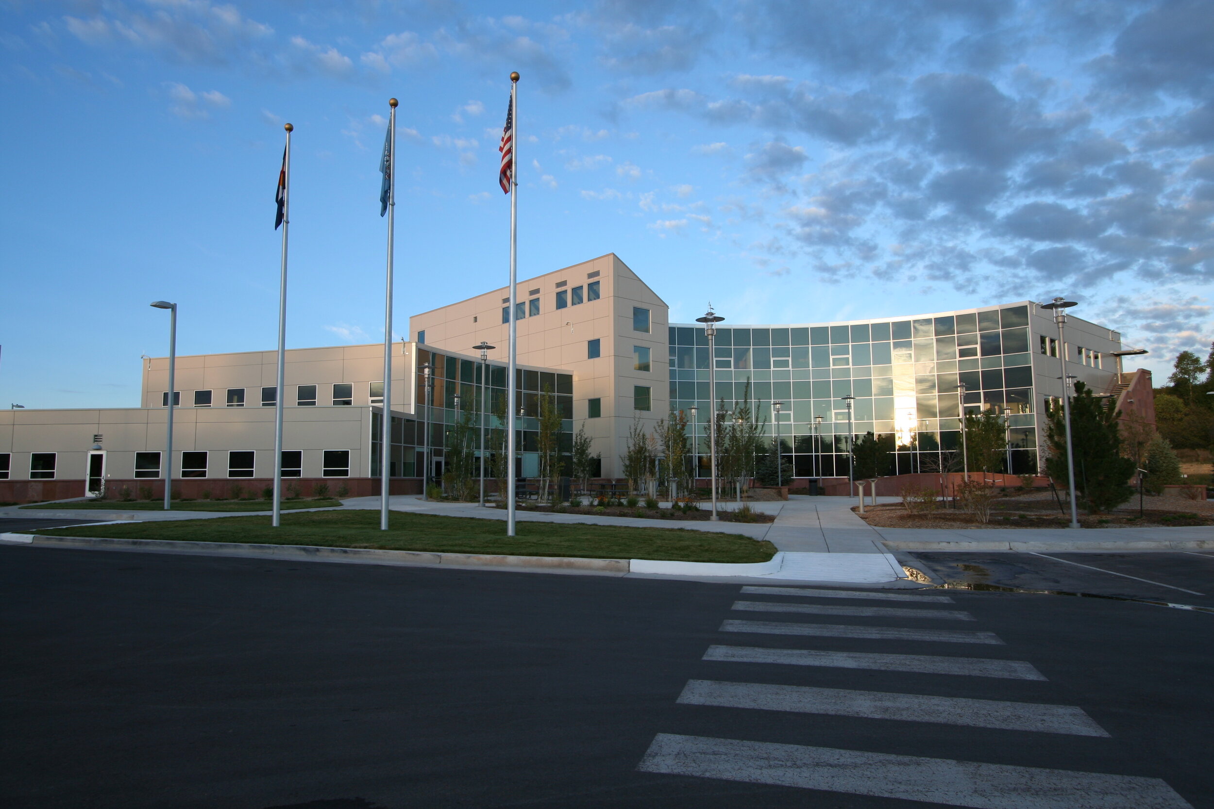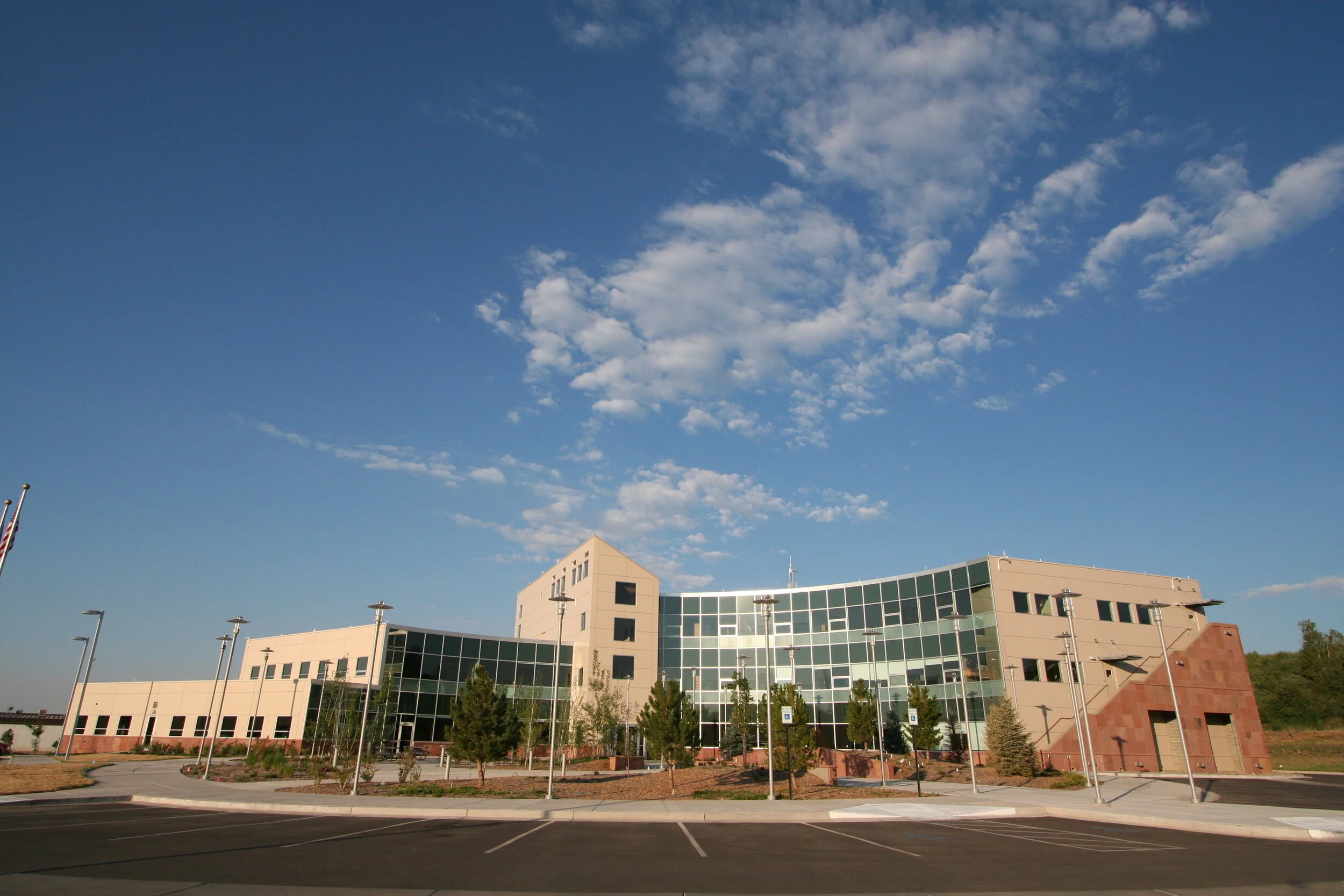 Commissioned by the Southern Ute Indian Tribe, the building is a state-of-the-art, fully-finished, office building. The three-story structure is fronted by a circular drive that is landscaped with native trees and grasses. Designed to gently step into the hill, its concave shape creates a sheltered outdoor space.