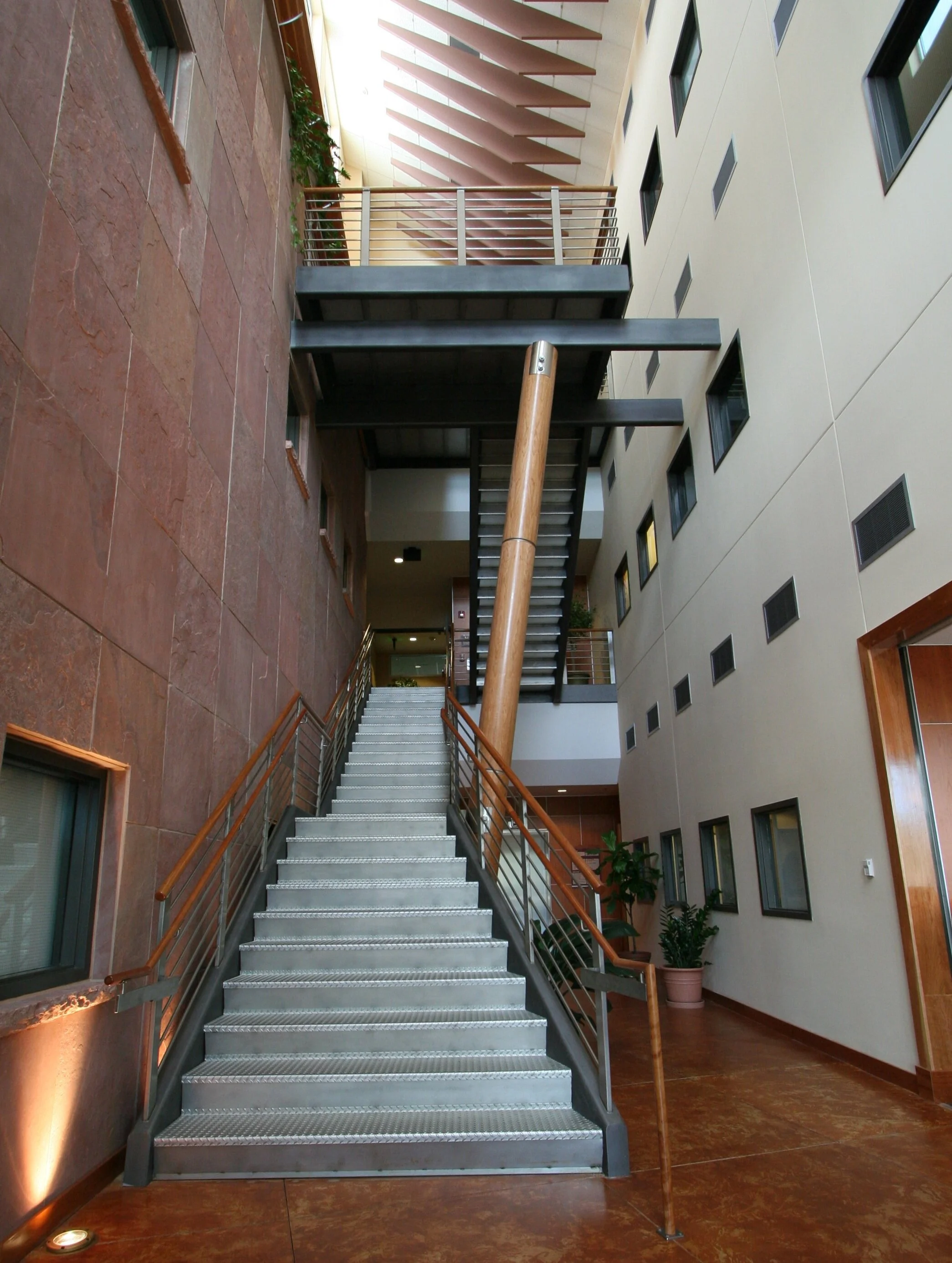 Building offices radiate from the light-filled courtyard that rises three-and-a-half stories to the roof. Cherry wood accents and etched glass panels accentuate the elegance of this building.*